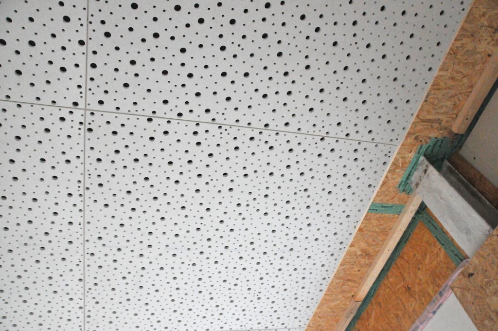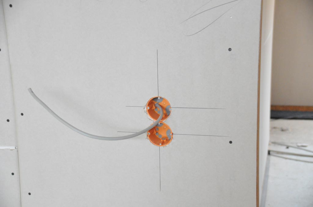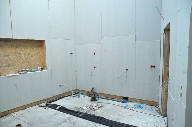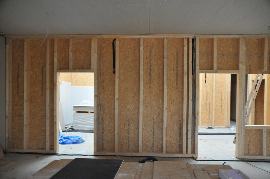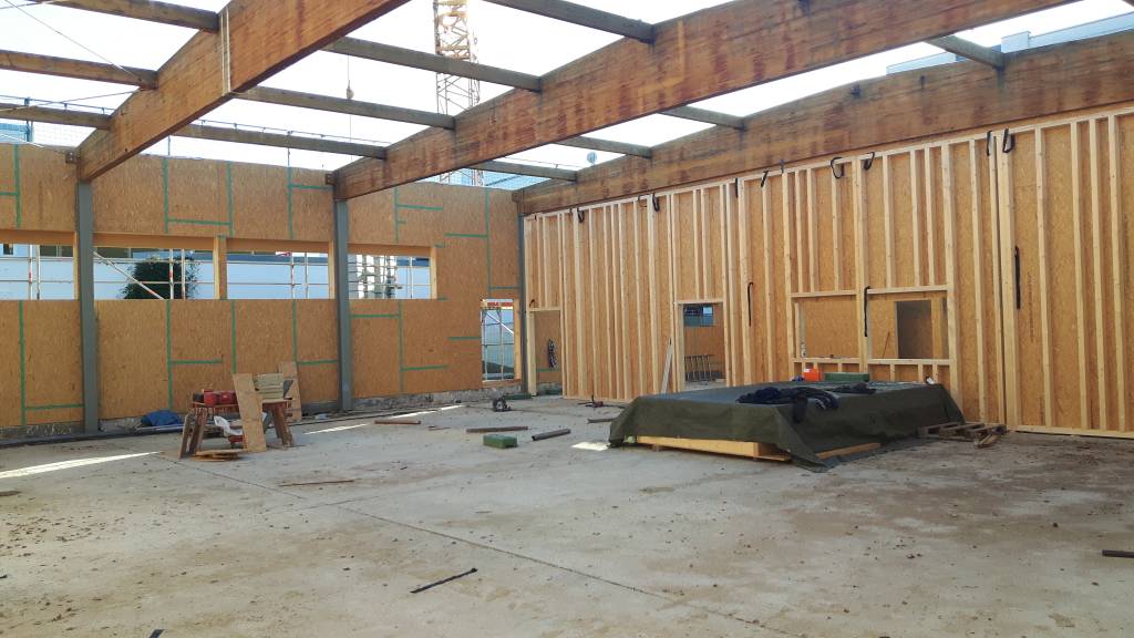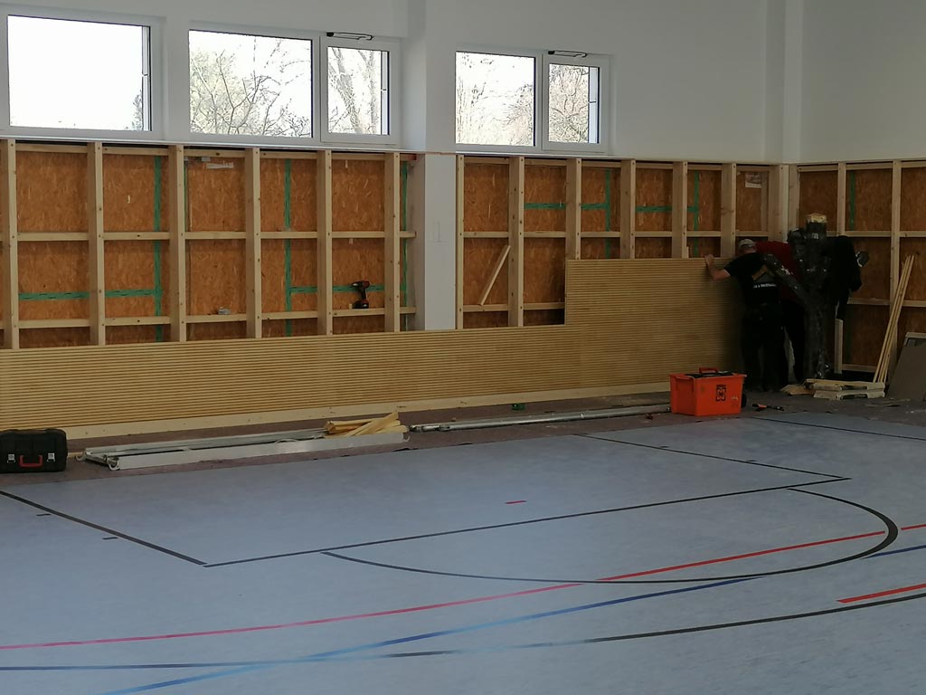 Die Wände der Mehrzweckhalle werden mit Trockenbau-Platten verkleidet. -