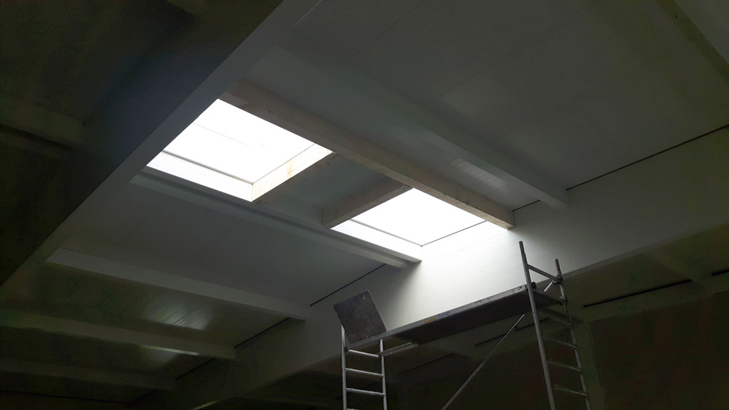 Die RWA-Fenster in der Halle werden eingebaut -